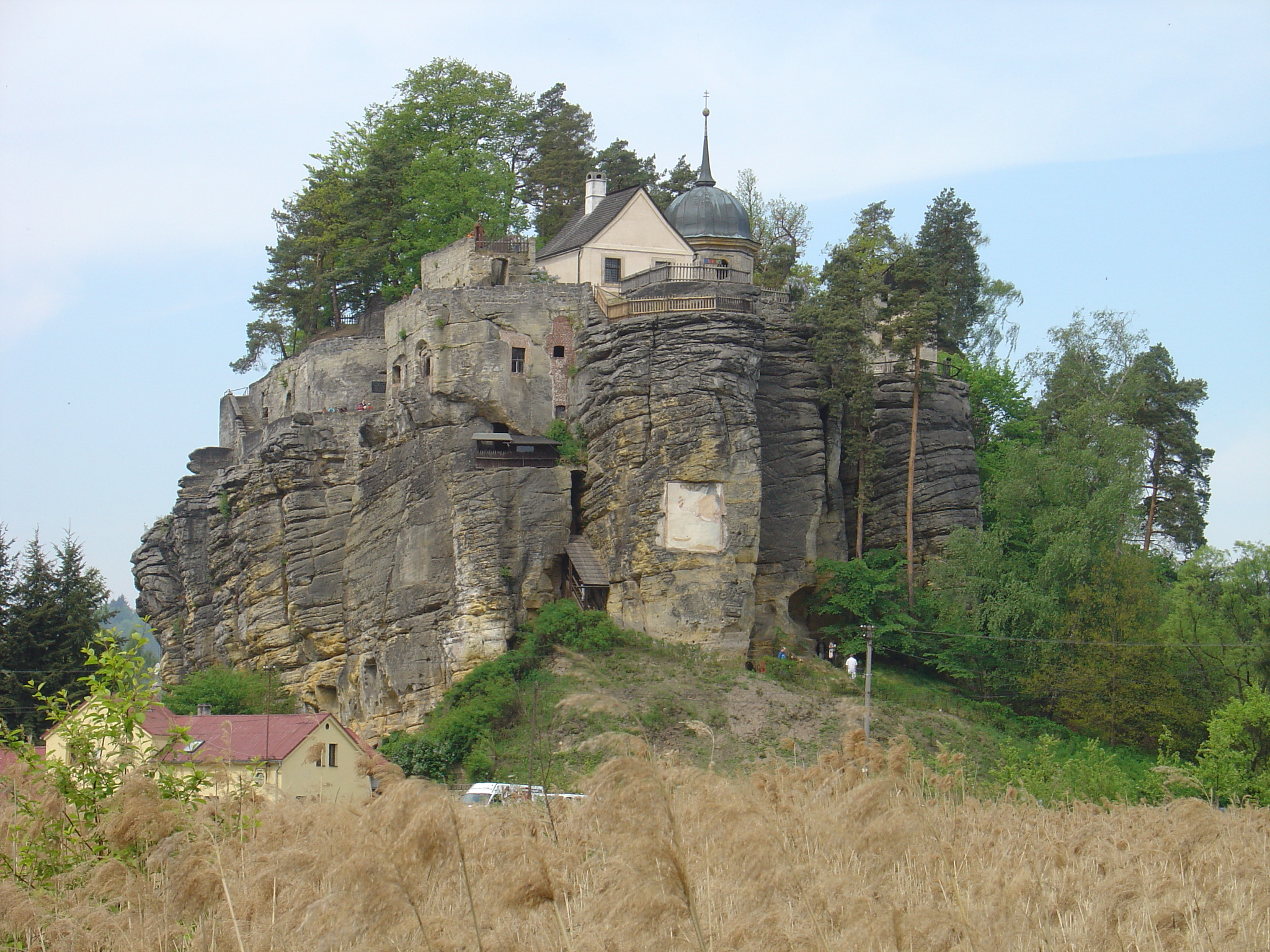 Die Felsenburg Sloup (deutsch: Einsiedlerstein) ist die bedeutendste Felsenburg Nordböhmens und ein echtes Naturwunder. In einen 40 Meter hohen, freistehenden Sandsteinfelsen gebaut – dem größten seiner Art in der Bürgstein‑Schwoikaer Schweiz – thront sie über dem Tal des Dobranovský potok und der Gemeinde Sloup.
